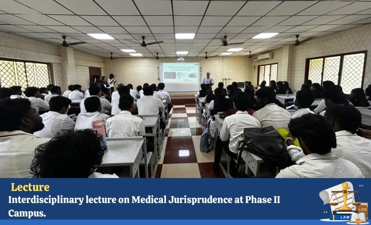 The faculty of Law is delighted to have organized an Interdisciplinary lecture on Medical Jurisprudence at Phase II Campus. The lecture was delivered by Dr.Ravi Hosaholalu, an eminent person and expert in the field of Forensic science and Toxicology.He delivered an insightful lecture on Medical negligence and it’s legal aspects and also highlighted the importance of Medical Jurisprudence in various aspects. The session highlighted the empowerment of healthcare professionals to understand the legal consequences of their actions while maintaining the ethical standards of patient care. He also highlighted the importance of four pillars , Bolam test and types of medical negligence.